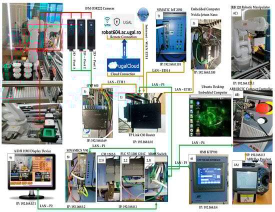 OPC-UA is integrated to ensure standardized and secure communication between various devices in the MRC. It enables interoperability between different systems such as the ABB 120 IRM, A/D/R stations, IoT sensors, PLC, embedded computer, cameras, video processing unit (VPU), IoT gateway, conveyor driver, and cloud-platform. OPC-UA acts as a bridge between the local control systems (SCADA, HMIs) and the cloud-based infrastructure, facilitating smooth data flow, A/D/R process coordination, and real-time communication. HMI-type SCADA systems are designed both for initialization and configuration and to work remotely and locally for monitoring and control [5,6,7]. Through a specialized communication device, instantaneous and time-horizon electrical data will be acquired from sensors, stored in the embedded computer or in the cloud, useful for developing an adaptive ML for the prevention of breakdowns and maintenance. Thus, the system has robust operation, at the same time ensuring data protection and inviolability [4].