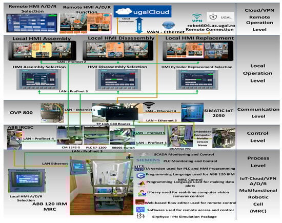 The flexible A/D/R operations performed by MRC consist of the assembly of two workpieces (WP1, WP2), disassembly, and replacement of cylinders with the recovery of parts for reuse [4]. The control structure, shown in Figure 2, is multilevel as follows: (1) Cloud/VPN remote operation level, with SCADA, remote HMI A/D/R, and remote HMI selection A/D/R for remote monitoring and control of assembly, disassembly, and replacement. (2) Local operation level, with SCADA, local HMI A/D/R, and local HMI selection A/D/R for local monitoring and control of assembly, disassembly, and replacement. (3) Communication level with video processing unit (VPU) OVP 800, Wi-Fi router, TP-Link Archer, and SIMATIC IOT2050 as the primary SCADA edge device that connects the various subsystems to the display devices or to the cloud. (4) Control level with the ABB IRC5C controller of ABB 120 IRM, PLC S7-1200 as main control unit, together with the Switch Ethernet Simatic SCALANCE XB005, SIEMENS CM 1242-5, and SINAMICS V90 for conveyer control, and NVIDIA Jetson Nano, a small, powerful computer for embedded applications that delivers the power for remote SCADA monitoring and control. (5) Process level with the ABB 120 IRM with an electric gripper that ensures the handling of parts inside the cell, and HMI KTP 700 as the local HMI selection of A/D/R MRC. Next to the MRC, the software packages used are listed along with their usage.