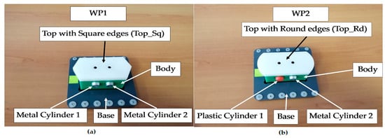 (a,b) The parts of the workpieces, WP1 and WP2. (a) WP1 with Top_Sq; (b) WP2 with Top_Rd.