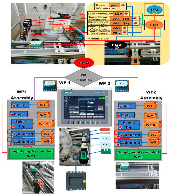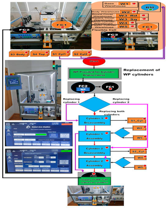 Through the scanning process with the 3D and VPU cameras, it is possible to select the type of workpiece, WP1 or WP2, to be assembled or the material of the cylinders, metal or plastic, to be replaced. After each assembly operation, the number of components in each storage warehouse is updated. After each completion of functionality, assembly, disassembly, and replacement of cylinders, the warehouses are updated. The workpiece, assembled or with replaced cylinders, is delivered on the conveyor belt to the right exit of the MRC, corresponding to the front view. The workpieces for disassembly or cylinder replacement enter the conveyor belt from the right side of MRC (the right side of the front view of the MRC, Figure 2).