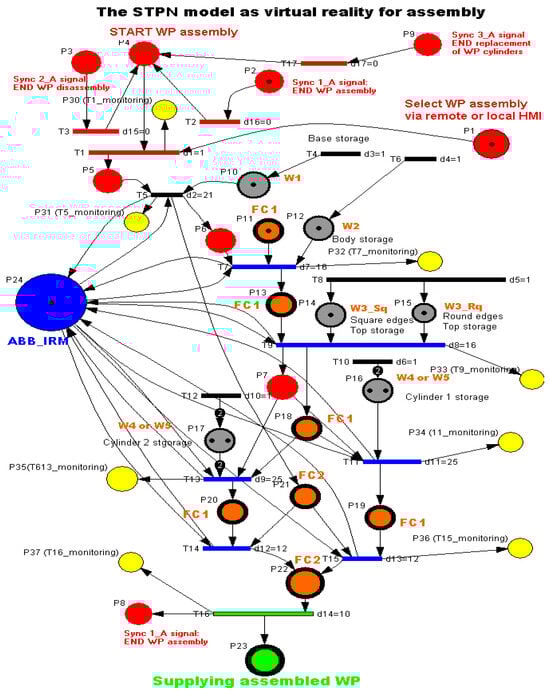 Following the task planning, the STPN model was developed for the assembly of WP1 or WP2, which involves taking parts from the warehouses, handling and assembling them in FC1 and FC2, respectively, and transporting the assembled workpiece on the conveyor to the right exit of the FRC, all this with the corresponding time durations. Three synchronization signals from the sensors are required to signal that the previous assembly, disassembly, or cylinder replacement has ended [4,5,6,7]. The STPN model is shown in Figure 7.