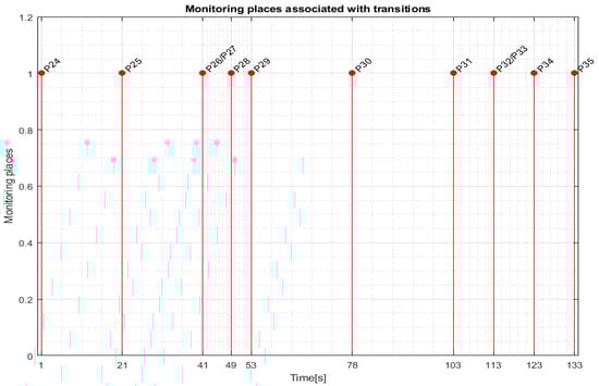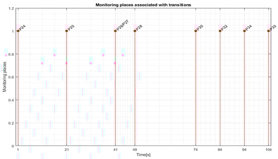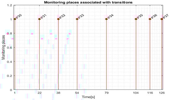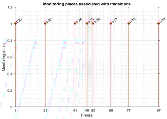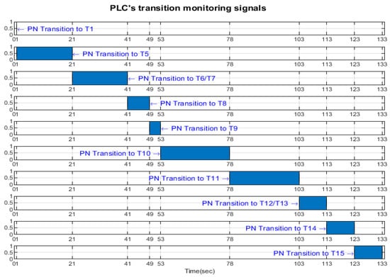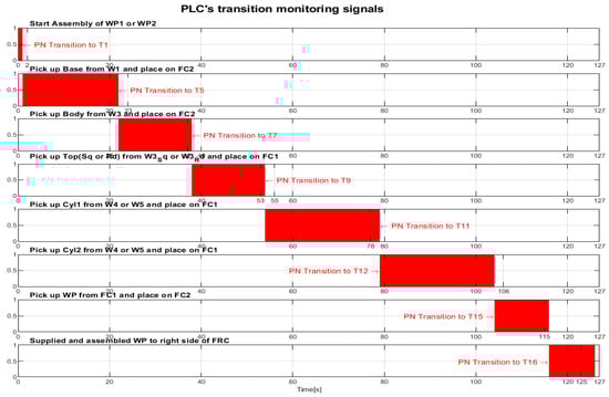 Transition monitoring states obtained by the STPN model simulation in Sirphyco, for the assembly processes of WP1 or WP2, are presented in Figure 8 [29,30]. As a result of the simulation of the STPN model, it can be seen in Figure 8 that the monitoring states receive tokens at a time interval corresponding to the initiation of the assembly function, together with the time interval associated with the current transition.