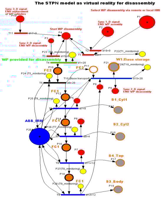 WP1 or WP2 is available for disassembly on the conveyor belt at the right entrance of the MRC. It is transported by the conveyor to the FC2 location. The ABB IRM takes the partially assembled workpiece (the part above the Pallet) and places it in the location of FC1. Here, the disassembly is performed by the ABB IRM by means of gripper accessories. The parts are disassembled by pushing them onto the slide chutes. At the end, the pallet is moved from FC2 to W1. The STPN model, with the corresponding transition time durations, is presented in Figure 9 [3,4,5,6]. The same three synchronization signals coming from the sensors are needed to signal that the previous assembly, disassembly, or cylinder replacement has been completed.