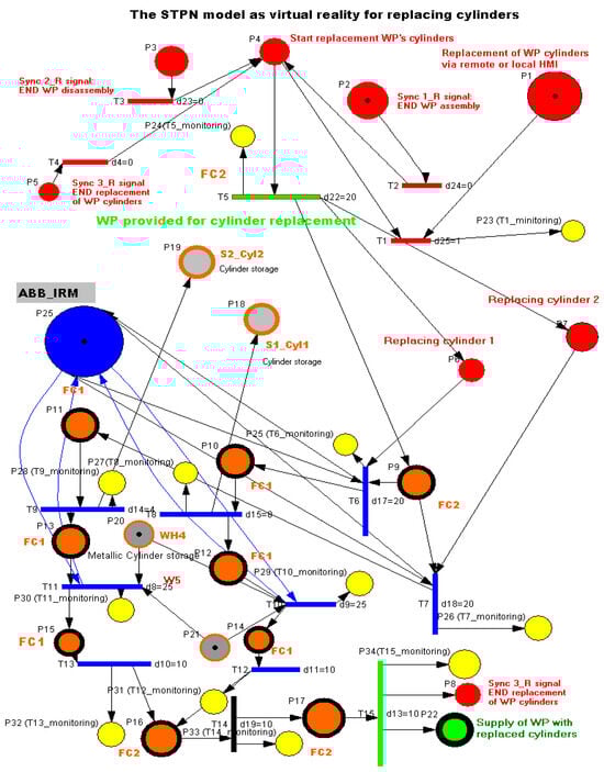 After it is moved by the ABB IRM onto the Base, on FC2. Finally, WP1 or WP2, with the cylinder replaced, is transferred along the conveyor belt to the right-side exit of the MRC. The STPN model for cylinder replacement, together transition time durations, are presented in Figure 11. The same three synchronization signals coming from the sensors are needed to signal that the previous assembly, disassembly, or cylinder replacement has been completed.