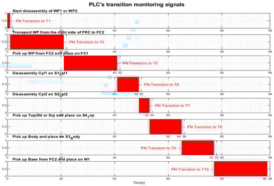 Transition monitoring states obtained by the STPN model simulation in Sirphyco, for the disassembly process of the WP1 or WP2, are presented in Figure 10. As a result of the simulation of the STPN model, it can be seen in Figure 10 that the monitoring states receive tokens at a time interval corresponding to the initiation of the disassembly function, together with the time interval associated with the current transition.