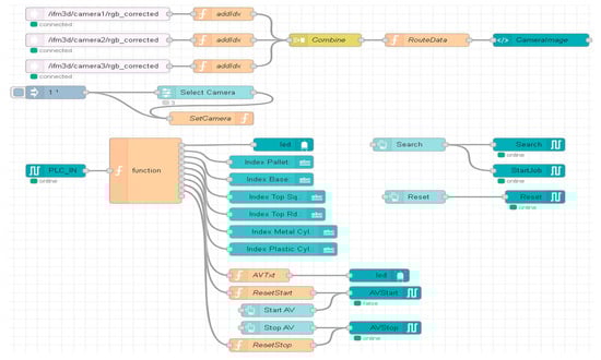 Using the Node-RED functions, and VNC Viewer, the A/D/R operations are monitored on the remote SCADA system, in real time. Using Node-RED functions, the flow in Figure 18 was elaborated to visualize the warehouses with components, as can be seen in Figure 19. The processing of these images in the OVP800 device allows for updating the number of components in each warehouse after performing component manipulation by ABB IRM.