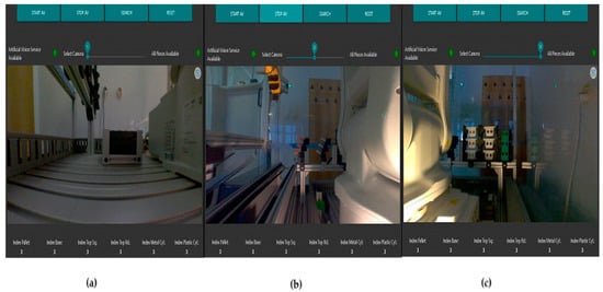 The Node-RED images captured from cameras; (a) warehouse with pallets; (b) the warehouse with metal cylinders and the one with plastic cylinders; (c) warehouses with bodies, with tops with square edges (Top_sq), and with tops with round edges (Top_rd), respectively.