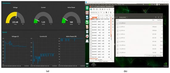 (a) Representation of gouge (instantaneous) and plot (records) of electrical data from the MRC; (b) The Virtual Network Computing (VNC)-Viewer MRC’s electrical recorded data in the embedded computer (edge device).