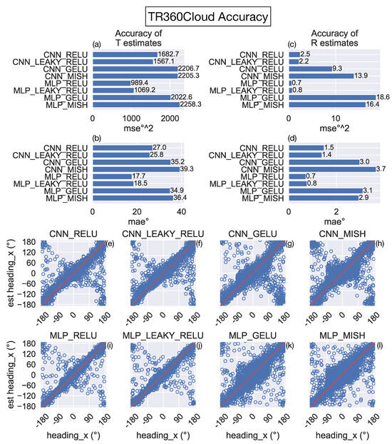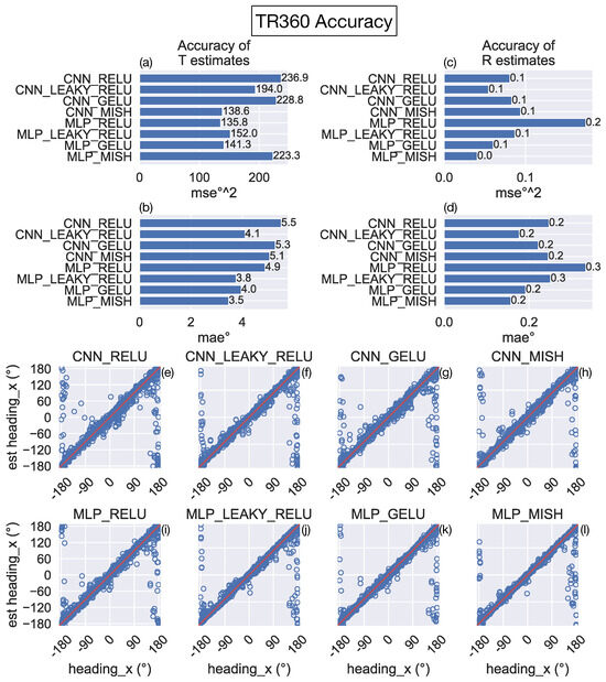 Figure 5a–d show that the mean error induced when estimating the translational and rotational self-motion of the camera is considerably larger overall than that obtained on the TR360 test set across all models (Figure 4). Interestingly, models with the ReLU and leaky ReLU activation functions garner substantially lower error in their estimates. For example, the MLP_RELU and MLP_LEAKY_RELU models yield approximately 50% of the MAE on translation estimates and 25% of the MAE on rotation estimates compared to the MLP_GELU and MLP_MISH models. The improvement with the ReLU and leaky ReLU activation functions occurs for both CNN and MLP architectures. The increase in accuracy is visually apparent from scatter plots showing the true and predicted translational azimuth angle for individual samples (compare Figure 5e,f with Figure 5g,h, Figure 5i,j and Figure 5k,l). In sum, these simulations show that networks that use the ReLU and leaky ReLU activation functions generalize better to the novel 3D dot cloud environment than the networks that use GELU and Mish.