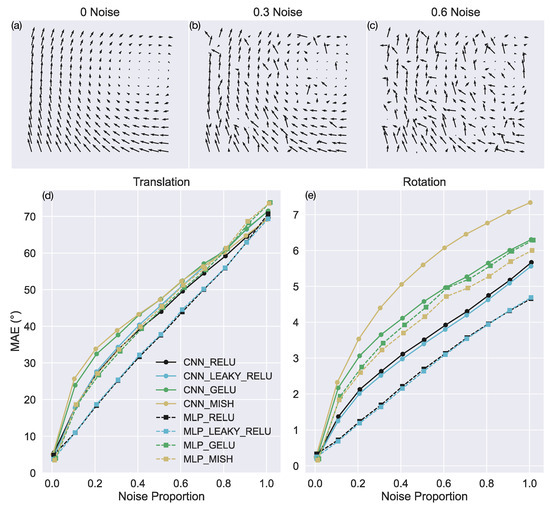Figure 6d,e show the average error in model translational and rotational self-motion estimates, respectively, for various amounts of noise. For translational self-motion estimates, MLP_RELU and MLP_LEAKY_RELU yield the lowest error across most noise levels (Figure 6d). In the case of intermediate levels of noise, the MAE in these networks is ≈7.5° lower than the CNNs with the same activation functions (CNN_RELU and CNN_LEAKY_RELU) as well as the MLP_GELU and MLP_MISH models. The MLP_RELU and MLP_LEAKY_RELU models also garner ≈10° lower error than the CNNs with GELU and Mish. There are less pronounced differences among the models for very low and high levels of noise.