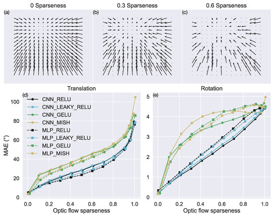 Figure 7d,e show that the models that employ the ReLU and leaky ReLU activation functions (CNN_RELU, CNN_LEAKY_RELU, MLP_RELU, MLP_LEAKY_RELU) produce substantially lower mean error for both translation and rotation than the models that employ GELU and Mish. For intermediate levels of optic flow sparseness, the ReLU and leaky ReLU networks produce ≈40% less MAE in their translational and rotational self-motion estimates. All the models perform poorly when the optic flow is extremely sparse (≥90%).