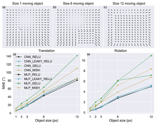 Figure 8d,e show the accuracy achieved by each model when samples in the TR360 test set contain square moving objects of different sizes. As the size of the moving object increases, the accuracy garnered by the models decreases. Consistent with the sparse optic flow test, CNNs and MLPs with the ReLU and leaky ReLU yield the lowest error in virtually every condition. The neural network architecture of these models exerts little impact on the accuracy.