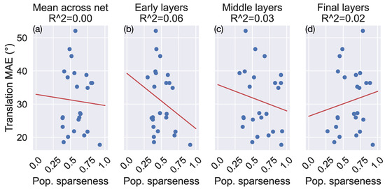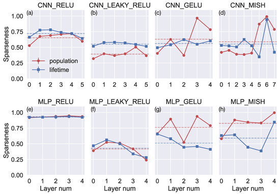 Despite the substantially different percentages of dead neurons, the MLP_RELU and CNN_RELU networks have large average population and lifetime sparseness (Figure 9). Given that these networks yield the lowest error in our generalization and robustness tests, this may seem to indicate a positive correlation between sparseness and generalization accuracy. However, when taking all the simulated networks into account, we observe no systematic relationship (Figure 10). Indeed, Figure 10 reveals considerable variability in the mean error obtained in networks with similar levels of sparseness. This is consistent with the fact that the networks with leaky ReLU yield similar generalization accuracy and robustness to those that use ReLU (Figure 5, Figure 6, Figure 7 and Figure 8), despite having relatively low average population and lifetime sparseness (Figure 9).