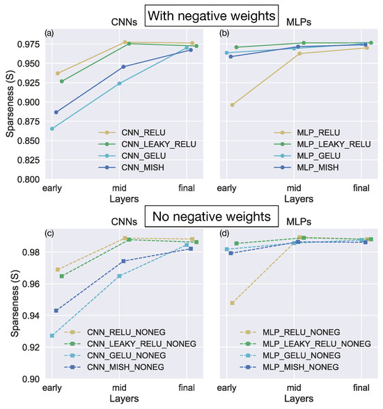 Despite the prevalence of dead neurons, Glorot and colleagues showed that multi-layer perceptron (MLP) neural networks configured with ReLU garner better accuracy on image datasets than MLPs configured with the other activation functions while generating incredibly sparse patterns of activations across the network [20]. Indeed, only ≈15–30% of neurons in the network activated to inputs. A sparse representation has the potential advantage of being invariant to noise and other small changes in the input [11,20,21]. By contrast, unimportant small fluctuations in an input may alter most components of a dense code that involves every neuron, making decoding from the network more challenging. Sparse codes may also increase the separability between dissimilar inputs because different features could recruit mostly non-overlapping neural subpopulations [22,23,24]. This could potentially enhance the speed and accuracy of inference [25,26].