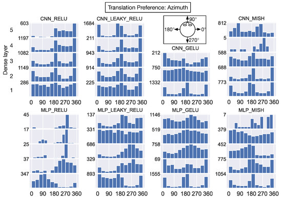 The histograms in Figure 12 show the translational azimuth angle preference of every neuron in the dense hidden layers of each model. We use a coordinate system wherein the positive and negative x-axis indicates 0° (i.e., rightward translation) and 180° (i.e., leftward translation) azimuths (see top-down schematic view in 3rd column of Figure 12). The CNN_RELU and CNN_LEAKY_RELU exhibit remarkably similar preferred azimuths across the network layers—preferences are broadly distributed in the first hidden layer and become more concentrated at 0°/180° (leftward/rightward) deeper in the networks. The CNN_RELU differs from CNN_LEAKY_RELU in the elevated number of units that prefer backward (270°) self-motion close to the output layer. Interestingly, the first dense hidden layer of the CNNs with smoothly varying negative activations (CNN_GELU and CNN_MISH) yields a bimodal distribution at 0°/180° that resembles the distribution that develops in CNN_RELU and CNN_LEAKY_RELU, but the pattern is not maintained in the deeper layers. The first dense layer of the MLP_RELU and MLP_LEAKY_RELU show a preponderance of units that prefer forward translation (0–180° Figure 12, bottom row). Most units in the next two dense layers of these models demonstrate a preference for backward self-motion (≈270°). This pattern is maintained in the final layers of MLP_RELU but not in MLP_LEAKY_RELU.