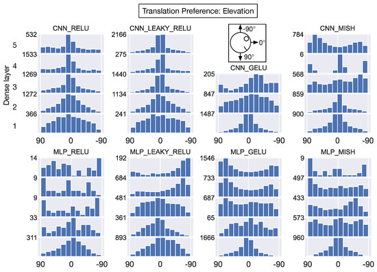 With respect to translation elevation angle preferences (Figure 13), all the networks demonstrate remarkable consistency in the dominant preference for 0° elevations (parallel to the ground) within the first hidden layer. This peak at 0° persists across layers only in the CNN_RELU, CNN_LEAKY_RELU, and CNN_GELU models. In most of the other networks, a predominance of units develop preferences for either ≈90° (downward translation) or ≈−90° (upward translation).