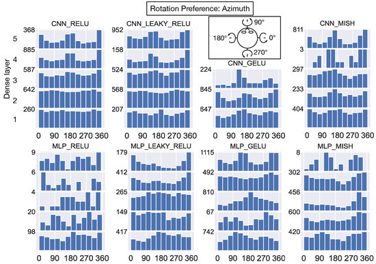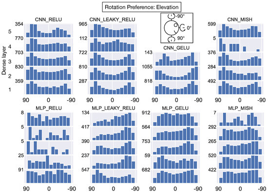 Next, we characterized the distribution of rotation preferences in the model layers. Figure 14 focuses on the azimuth angle of the preferred direction of rotation (see top-down schematic view in 3rd column of Figure 14). Interestingly, the rotation azimuth angle preferences are broadly distributed in the first dense hidden layer of all the networks. Similar to the distribution of translation azimuth preferences that emerge in deeper layers of CNN_RELU and CNN_LEAKY_RELU (Figure 12), bimodal distributions that peak at ≈0/180° appear in the deeper layers of CNN_RELU, CNN_LEAKY_RELU, CNN_MISH, and MLP_GELU for rotation azimuth (Figure 14). Figure 15 reveals a similar pattern where the preference rotation elevation angle is broadly distributed in the first dense layer, and units in most networks cluster in their elevation preferences in the deeper layers. Many units in these deeper layers demonstrate a preference for rotation about either ≈90°, ≈−90°, or both elevations.