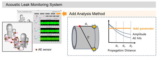 The locations of Acoustic Emission (AE) sensors are determined through computational structural analysis; typically, about 20 sensors are installed near welds and valves. These locations are crucial for detecting early defects because system anomalies are more likely to originate near welds and valves []. Signals emitted from cracks and leaks propagate along the surface of the pipe, attenuating as they travel. According to a study by Graham and Alers, in pressure vessel testing, the amplitude decreases linearly with propagation distance, but the rate of decrease is faster near the signal source [,]. This is because the signal energy is consumed intensively at close range. ALMS with AE sensors installed near the welds (and valves) can effectively detect the presence of cracks or leaks, but they have limitations when it comes to quantitatively evaluating these defects. For example, it is difficult to predict the optimal maintenance timing because the size and growth rate of cracks cannot be identified. Similarly, the inability to quantify the amount and rate of leakage makes it challenging to accurately assess the severity of leakage risks.