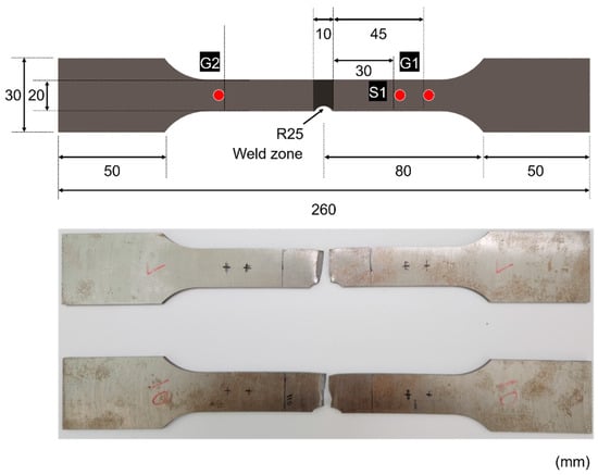 In this study, SM45C structural steel with a thickness of 5 mm, produced by POSCO (Pohang-si, Republic of Korea), was used. The specimen was cut into a rectangular plate and then butt-welded. The welding rod used was TGC-50 (Chosun welding Co., Ltd., Pohang-si, Republic of Korea), and welding was performed using an argon welding process with argon gas as the shielding gas. The surface of the specimen was milled to a thickness of 3 mm, and the surface roughness (Rmax) was adjusted to a range between 12.5 and 25S. Subsequently, the specimen was fabricated into a dog-bone shape through laser machining; the detailed dimensions are presented in Figure 2. The specimen conforms to ASTM E8/E8M, the standard test method for tensile testing of metallic materials [].