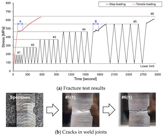 Fracture test results: (a) step-loading design dividing the maximum tensile load into six stages, (b) image showing crack growth progression at each stage, with the monitoring target up to the flow region (A,B).