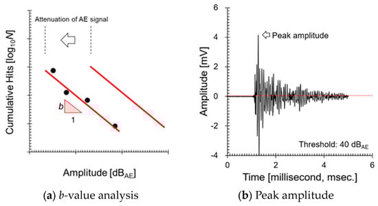 Description of b-value analysis: (a) b-value analysis method, (b) AE signal amplitude used in the analysis to evaluate crack progression.