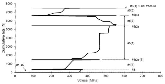 The objective of this study was to integrate a crack analysis algorithm into the ALMS system to detect and evaluate the crack growth process in the primary system piping of nuclear power plants. To achieve this, a fracture test was conducted by applying stepwise loading using welded specimens that simulate the primary system piping of nuclear power plants. During this process, AE signals were measured using the AE testing system as the strain increased. Figure 5 shows the results of accumulated AE signals visualized according to the change in axial load. This figure helps clearly understand how AE signals accumulate under repeated loading. The Kaiser effect refers to the phenomenon where no AE signals are generated during loading if the applied load does not exceed the material’s previously experienced maximum load [,]. In contrast, the Felicity effect refers to the phenomenon where AE signals are generated even at loads lower than the previous maximum load, indicating instability related to crack propagation []. In ranges #1 and #2 of Figure 5, the Kaiser effect was observed at loads below 280 MPa, indicating that the cracks are growing stably (with minimal damage to the material). The occurrence of the Felicity effect after 280 MPa indicates that the cracks are growing unstably, which shows that damage to the material is progressing (#3, #4, #5, #6). In #5(3), AE signals are emitted during the unloading phase, which occurs because permanent deformation occurs in the weld cracks, leading to crack growth under compressive forces. Through these observations, the stability and instability of crack growth can be assessed, providing essential information for diagnosing the safety of structures.