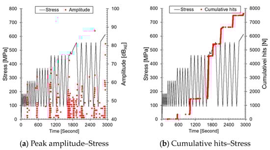 Representation of AE parameters under varying load conditions: (a) amplitude as a function of stress, reflecting the maximum size of AE signals; (b) cumulative AE hits as a function of stress, indicating the number of AE events during the test.