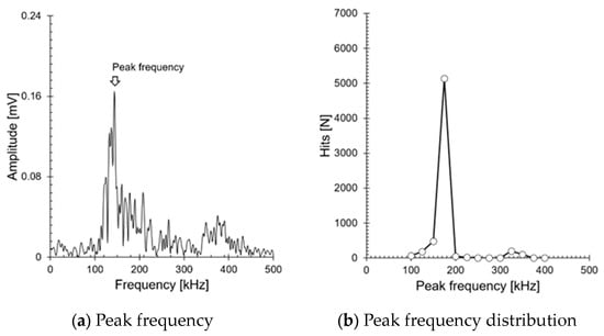 Peak frequency characteristics of AE signals: (a) peak frequency of AE signals; (b) frequency distribution (white circle) of AE signal peak frequencies measured during the test.