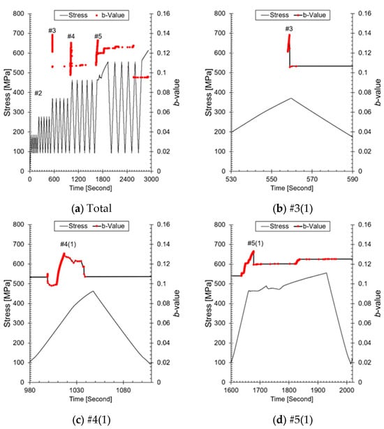 Amplitude-based b-value analysis: (a) total b-value calculated from AE signal amplitude; (b) b-value analysis at step #3(1); (c) b-value analysis at step #4(1); (d) b-value analysis at step #5(1), showing changes in crack progression.