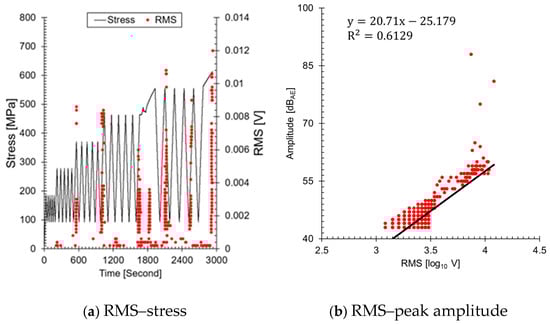 RMS characteristics of welded specimens: (a) RMS as a function of stress, reflecting the energy of AE signals; (b) RMS compared to peak amplitude, indicating the correlation between these AE parameters during crack progression.