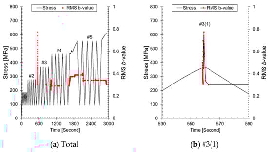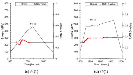 In the ALMS used in the primary system, amplitude values that do not exceed the fault threshold are not recorded. Here, the threshold refers to the criterion for triggering the alarm and should be distinguished from the threshold used for measurements. Therefore, it is necessary to use other AE parameters for b-value analysis. Figure 9 shows the results of visualizing the RMS, an AE parameter stored to assess leaks in the ALMS. The reason both values increase similarly with changes in load is that both parameters reflect the energy of the AE signals. RMS represents the total energy of the AE signal, while amplitude reflects the instantaneous maximum value of the signal. As the load increases, the energy emitted from defects within the material also increases, leading to a similar increasing trend in both parameters (Figure 9b). However, it is important to note that the data are subject to limitations due to the use of an amplitude-based threshold during the measurement phase. This threshold ensures that only signals exceeding a certain amplitude are recorded, which could result in the underrepresentation of lower energy AE events that might still be significant for b-value analysis. Consequently, this may have influenced the correlation (0.6129) between amplitude and RMS values, as well as the overall assessment of crack progression. Therefore, during the calculation of the b-value, amplitude was replaced with RMS; the results are presented in Figure 10a. The b-value calculated based on RMS shows a similar trend to that calculated based on amplitude (see Figure 8). To observe the increase and decrease of the RMS-based b-value, #3(1), #4(1), and #5(1) were highlighted again in Figure 10b–d. The RMS-based b-value increased when micro-cracks grew at the crack tip and decreased when macro-cracks occurred. These results are consistent with the analysis based on amplitude and cumulative AE hits. If the RMS-based b-value is applied to the drain valve event mentioned in the introduction, it is expected to serve as a fundamental datum for assessing the growth and reduction of micro-cracks before leakage. The results of this study demonstrate the potential to monitor and assess the crack status of nuclear power plant piping in real time using AE data. In particular, it suggests a method to enhance the safety of nuclear power plants and quantitatively understand crack progression by adding a simple AE analysis to existing methods. However, there is a limitation in that the relationship between crack growth, RMS, and the b-value has not been experimentally proven. This aspect will be pursued in future research.