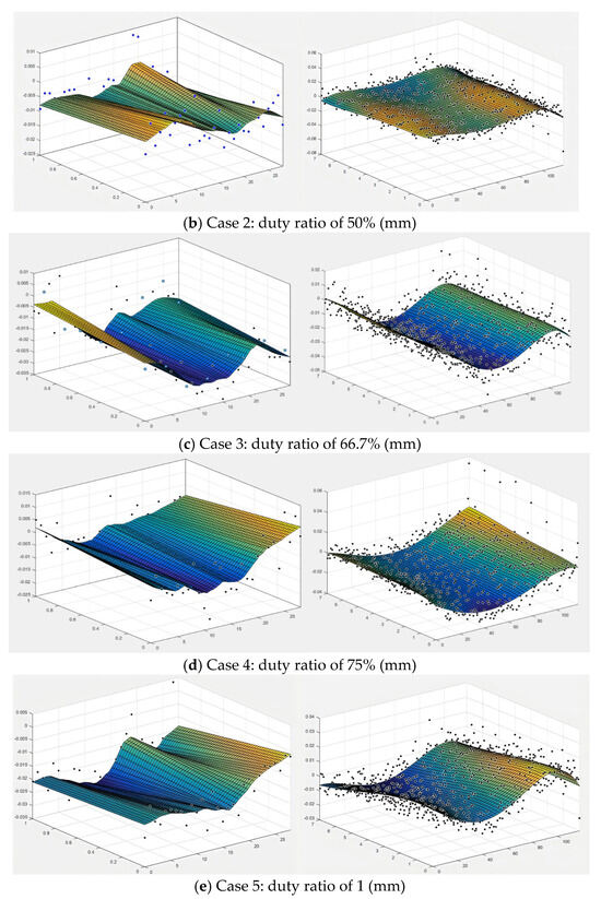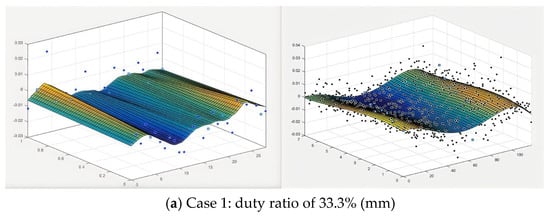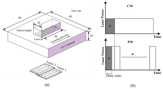 | Case | Mode | Power (W) | Scanning Speed (mm/s) | Rate from Powder Feeding (g/min) | Number of Layers | Pulse Frequency (Hz) | Duty Ratio |