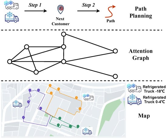 As shown in Figure 1, some customer nodes are deployed in a city area, whose positions are fixed and can be precisely determined. These customer nodes are visited by the refrigerated trunks with different temperatures for fresh food supply. We utilize an abstract attention graph to map out the system’s nodes and potential routes. Each customer node has defined data and collection windows that act as constraints for visit order. Because of urban mapping constraints, the graph only includes existing paths, limiting route planning to these routes. We have created a two-step route planning method for refrigerated trucks to streamline planning within a smaller state space. First, we pick the next customer node from those available to be the immediate destination. Second, we guide the trucks to take a viable route to get to that destination.