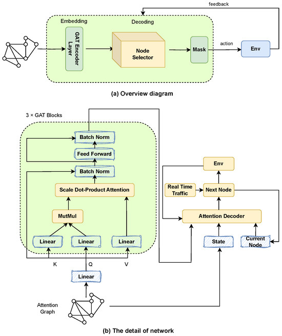Figure 2a shows an overview of the proposed model, which includes a graph attention encoder and a node selection decoder. The graph attention encoder is responsible for embedding the input attention graph information into the feature vector, and the node selector uses the embedded information to select the next node to be accessed. When selecting nodes, it is necessary to meet the constraints of the corresponding time window and load capacity. After executing the action, the environment will provide feedback on the result, and the node selector will continue to select the next node based on the current state until the end.