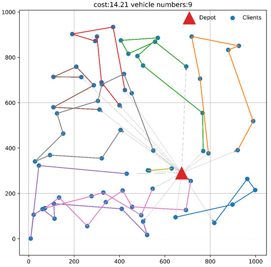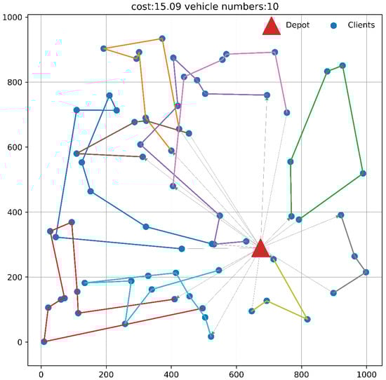 In this section, we use DRL to select the optimal location for the warehouse. We first selected an instance with 70 nodes, where the customer nodes’ locations are the same as in the original instance, and there are four available warehouse nodes, which are randomly generated using a uniform distribution. The cost of each refrigerated truck is determined based on the truck’s capacity, and the total delivery time is 8 h. The customer nodes’ time windows are selected from [0, 2], [2, 4], [4, 6], and [6, 8]. According to the model’s definition, transportation costs, carbon emission costs, and refrigeration costs are all taken into account. The objective function values are calculated for each selected warehouse, and the optimal warehouse location is compared. The customer nodes’ coordinates, time windows, and demand quantities are shown in Table 6, and the parameters related to refrigerated transportation are listed in Table 2. The average driving speed of the truck is set at 32 km per hour, fuel consumption is 0.377 L per kilometer, the daily usage cost of the truck is 100, the daily rental cost of the warehouse is CNY 1000, the fuel price is CNY 7.25 per liter, and the carbon tax price is CNY 1 per kilogram.