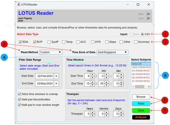 The LOTUS reader is designed to selectively read and compile raw EmbracePlus data and output the reconstituted signals in mat files that can be processed in the LOTUS analyser or other programs. This reader is flexible when handling Empatica EmbracePlus data, allowing users to specify parameters like the input file format (i.e., avro or CSV), for cases where the datasets have or have not already undergone a conversion. Figure 1 shows the GUI and basic workflow for the LOTUS reader, involving a single-panel interface allowing users to specify the read settings.