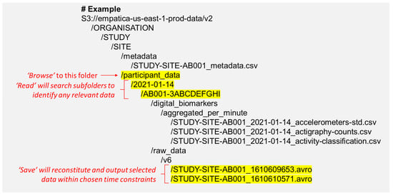 Example of a folder and file structure from the EmbracePlus manual [39], annotated to show where to browse for LOTUS input. After browsing to the participant_data folder, clicking the read button will identify the relevant data and update the subject list.
