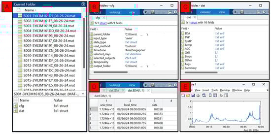 Figure 4 shows an example of the output generated using the custom read method to read EDA, BVP, systolic peak, temperature, and accelerometry data between 9 and 10 a.m. for several participants (i.e., S001, S002, etc.). Mat files are generated for each unique recording and labelled with the subject–device identifier and start date for the extracted timeseries, and contain a cfg and dat structure (Figure 4, Panel A). The cfg structure contains information regarding the parent folder for the input, the input and output type selected, the read method, the time zone, and other metadata (Figure 4, Panel B). The dat structure contains cells housing the raw continuous data, along with a table detailing the event tags, and a data summary (Figure 4, Panel C). Timeseries data in each cell are stored as a table with columns for universal standard time, local time (according to the selected time zone), and the raw data; an example of EDA data for one subject is shown in Figure 4, Panels D and E. Data from the other modalities (e.g., BVP, SystP, Temp, ACC) are output across the same timeframe, albeit at their given sample rate (e.g., Figure 3).