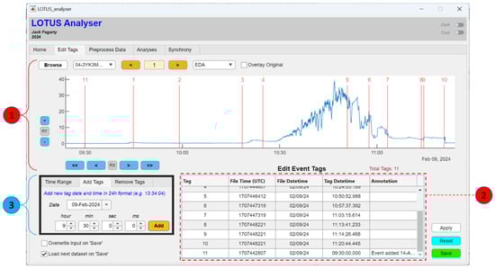The LOTUS analyser, with the Edit Tags tab displaying reconstituted EDA data from a dat file output by LOTUS reader. The central plot displays the EDA timeseries (blue line), with red vertical lines showing the tags, consistent with those listed in the table and the input dat file. (1) Common tab controls to browse, load, and visualise data. (2) Event tag table. (3) Panel controls to add and remove event tags.