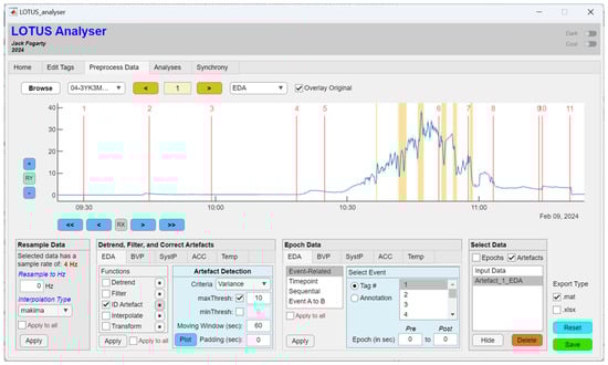 The LOTUS analyser aims to provide a comprehensive set of tools for researchers to interactively process and analyse wearable data. The GUI for the analyser is shown in Figure 4 and Figure 5, featuring several tabs with functions that allow users to load, visualise, and navigate raw data, edit tags, conduct standard preprocessing, and output modified data. The two tabs used to edit tags and preprocess data are described here in the subsequent sections. Details for the Analyses and Synchrony tabs will be provided elsewhere, pending further development.