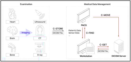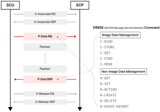 DICOM is a broad standard that covers the entire system for storing, transmitting, searching, and viewing medical images. DICOM specifies the file format, transmission protocol, and data format of image data. Of these, the DIMSE protocol is part of DICOM and is the protocol responsible for transmission. DIMSE (DICOM Message Service Element) is a protocol that indicates the method of exchanging data between entities using a network. An overview of DICOM and DIMSE in the overall healthcare system is shown in Figure 1.