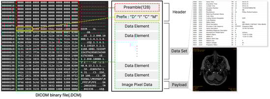 The DICOM file format structure ( in this figure, we used a DICOM file from The Cancer Imaging Archive (Creative Commons Attribution 3.0 Unported License) [23], in which Data Set and Payload are integrated).
