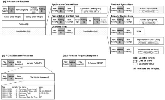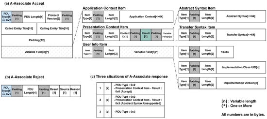 Requesting a medical service from one healthcare IT system to another requires transmitting information about the SOP Class, which allows the DIMSE protocol to determine what services are available for a specific system. For this information to be transmitted, a connection process between the two entities is required, which is defined as the A-Associate phase in the DIMSE protocol. As shown in Figure 3, this is the very first stage of the data exchange process. The packet fields used to establish this connection are shown in Figure 4a. These fields consist of multiple components, and their purposes are outlined in Table 1.