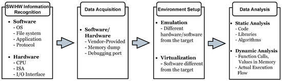 The first stage, Software/Hardware Information Recognition, involves pre-emptively identifying and cataloging information about the target before performing the analysis. This preparatory step is crucial for planning and facilitating subsequent stages effectively. In this stage, software-related information such as the operating system (OS), file system, application details, and protocols is identified. For hardware, details such as the CPU model, instruction set architecture (ISA), and types of I/O interfaces are gathered.