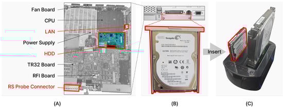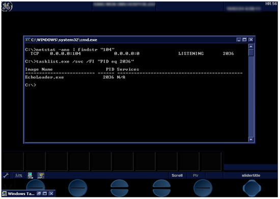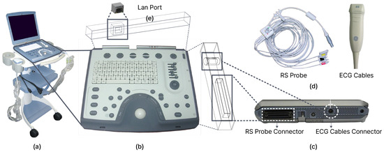 The major components of the medical device are shown in Figure 6. Vivid-i (Figure 6a) has several interfaces, among which the ones related to DIMSE are introduced. The Keyboard and Operator Panel (Figure 6b) has a keyboard and buttons for various functions, among which the “Store” button has the function of exchanging DIMSE data with the outside. On the right side (Figure 6c) are ports related to sensors, including the ECG Cable Connector and RS Probe Connector. These are for connecting the ECG Cables and RS Probe. The ECG Cables is used to monitor and record the electrical signals of the heart, and the RS Probe uses an ultrasound sensor to contact the actual patient’s body to examine the patient’s internal condition and collect data (Figure 6d). On the back, there is a LAN port for entering and exiting DIMSE data with the outside (Figure 6e). The overall process is to collect patient medical data through sensors (Figure 6d) connected to the port (Figure 6c), save it as a DICOM file in the medical device, and communicate it with the outside world through a button (Figure 6b), and such communication is achieved through a LAN port (Figure 6e).