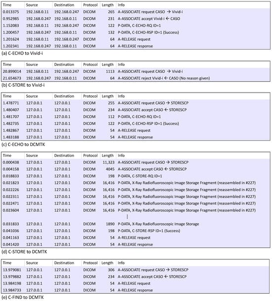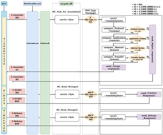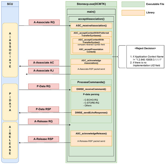Vidyashree et al. [26] describe the implementation of the DIMSE protocol in detail. Their study describes the commands belonging to DIMSE, shows the message structure and primitives in the actual DIMSE protocol, and describes the message fields and parameters of C-ECHO, C-STORE, and C-MOVE in detail. It also explains the relationship between DICOM files and the DIMSE protocol. It describes the A-Associate request, the steps to accept the request, and the response steps of C-ECHO, C-STORE, C-FIND, and C-MOVE in P-Data in detail through log capture. This study details the message fields for C-STORE, C-FIND, and C-MOVE of the actual DIMSE protocol through three stages, which helps in understanding the A-Associate stage, which is the most core part of our framework design.