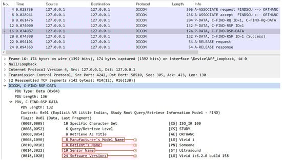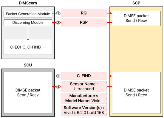 In the past, healthcare IT systems used different file formats and different data transmission methods for each manufacturer, and as this diversity increased, a single integrated healthcare IT system protocol emerged, which is the DICOM (Digital Imaging Communications in Medicine) protocol [15,16,17]. In particular, it explains how healthcare services and medical data are exchanged and structured in packet units for network communication between healthcare IT systems. To probe healthcare IT systems that can be accessed online, we present a framework to identify medical services that are supported by the target system. And we show that our framework can also be used to obtain patients’ personal information and details of the target system, including S/W version, product name, and sensor name, which are exploited to enable different security attacks based on its corresponding CVE (Common Vulnerabilities and Exposures) [18,19,20,21,22].