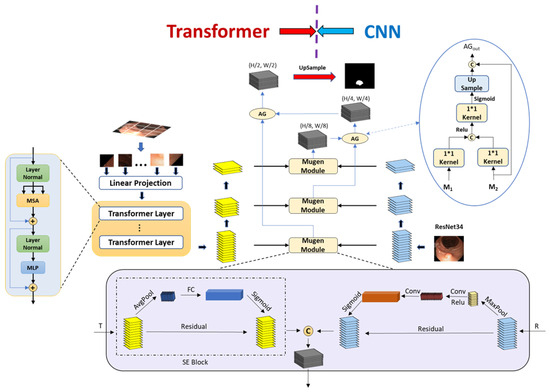 ResNet-34 [27] was chosen as the CNN branch, as a trade-off between retaining and losing more local information during training. The proposed model used two up-sampling operations to generate three matrices, which stored the feature maps of different scales; as depicted in the inset in the upper right part of Figure 1. These feature maps can be utilized to progressively restore the spatial resolution in subsequent processes. The matrix obtained through the convolution operation in the CNN branch (the right side of Figure 1 served as the input to the Mugen module and fused with the result obtained from the Transformer branch, which will be discussed in the next section.
