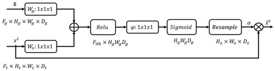 From the Mugen module, three feature maps of different dimensions can be obtained. Then, attention gate (AG) was used to restore the resolution of attention. It is worth noting that, according to [32], AG can focus on target architectures of different shapes and sizes, suppress irrelevant regions in the input image, and highlight the target features of specific tasks [33]. The architecture of AG in the Mugen is shown in Figure 1.