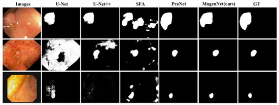 Figure 3 displays the polyp segmentation results of MugenNet on the Kvasir dataset, comparing our model with U-Net, U-Net++, SFA and PraNet, where GT represents the ground truth. Our model can accurately locate polyps of different sizes and textures, then generate semantic segmentation maps. It is worth noting that the results of other models are compared with the results from [43].